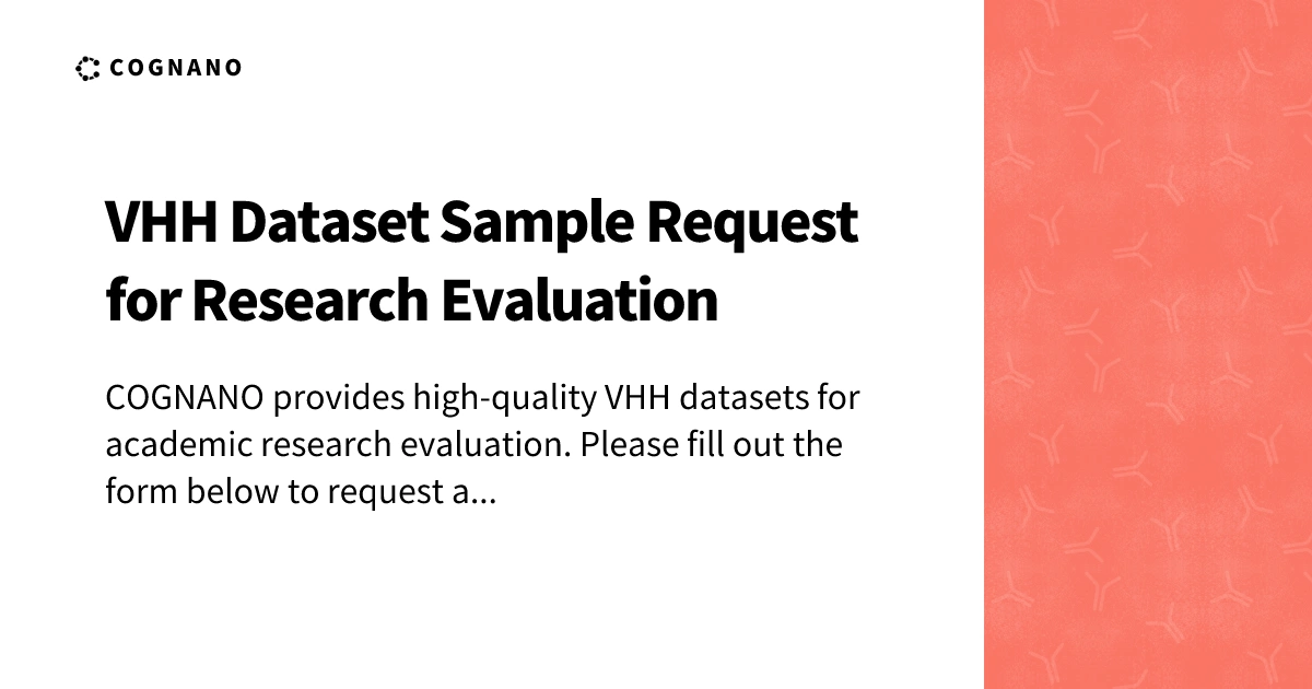 - Application via Dedicated Form: Please enter the required information and a summary of your research through the "VHH Dataset Sample Request for Research Evaluation."collaboration-sample-data-requestCOGNANO provides high-quality VHH datasets for academic research evaluation. Please fill out the form below to request access. Please note that access to the dataset is subject to your agreement to the "Material Transfer Agreement (MTA) for VHH Antibodies”.
